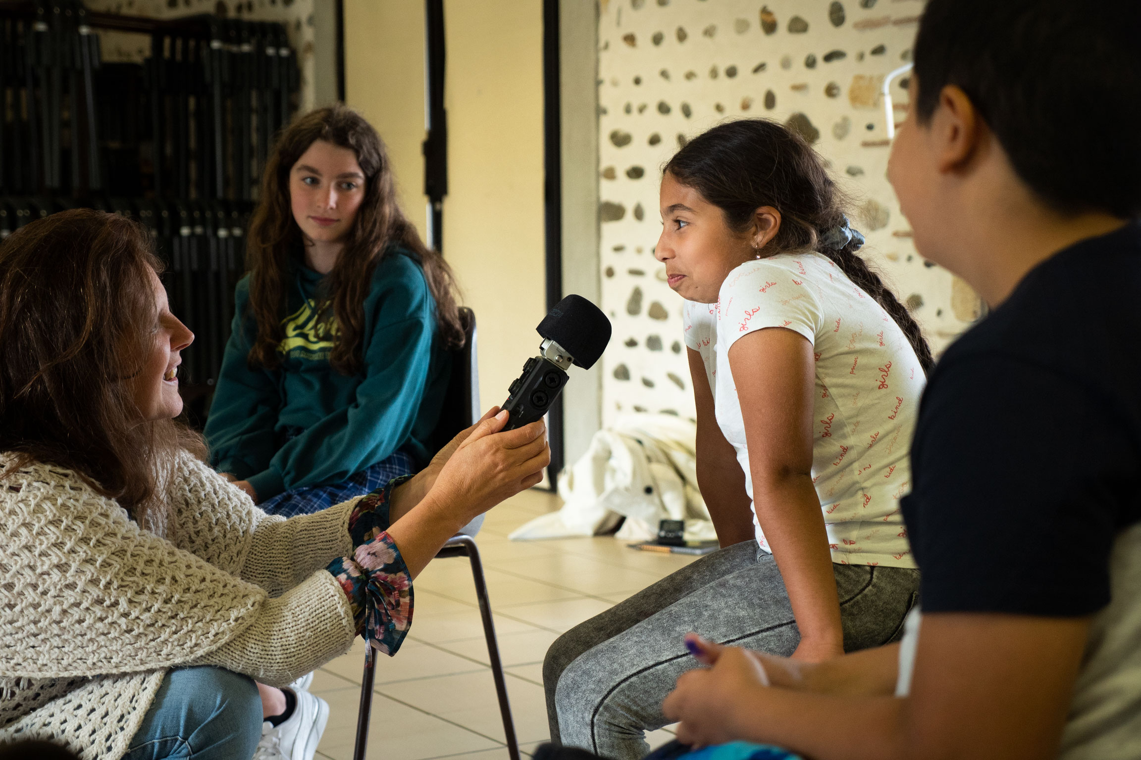des ateliers artistiques : le spectacle En sortant de l'école intègre la participation d'une partie du public et des moments enregistrés en amont. Ces ateliers s'adressent à des enfants, des collégiens, des lycéens, séniors ou habitants... Ils portent sur l'expression théâtrales, la créativité, l'expression personnelle. Ces ateliers peuvent aussi prendre la forme de séances d'enregistrement ou de micro trottoir qui figureront ensuite dans le spectacle.