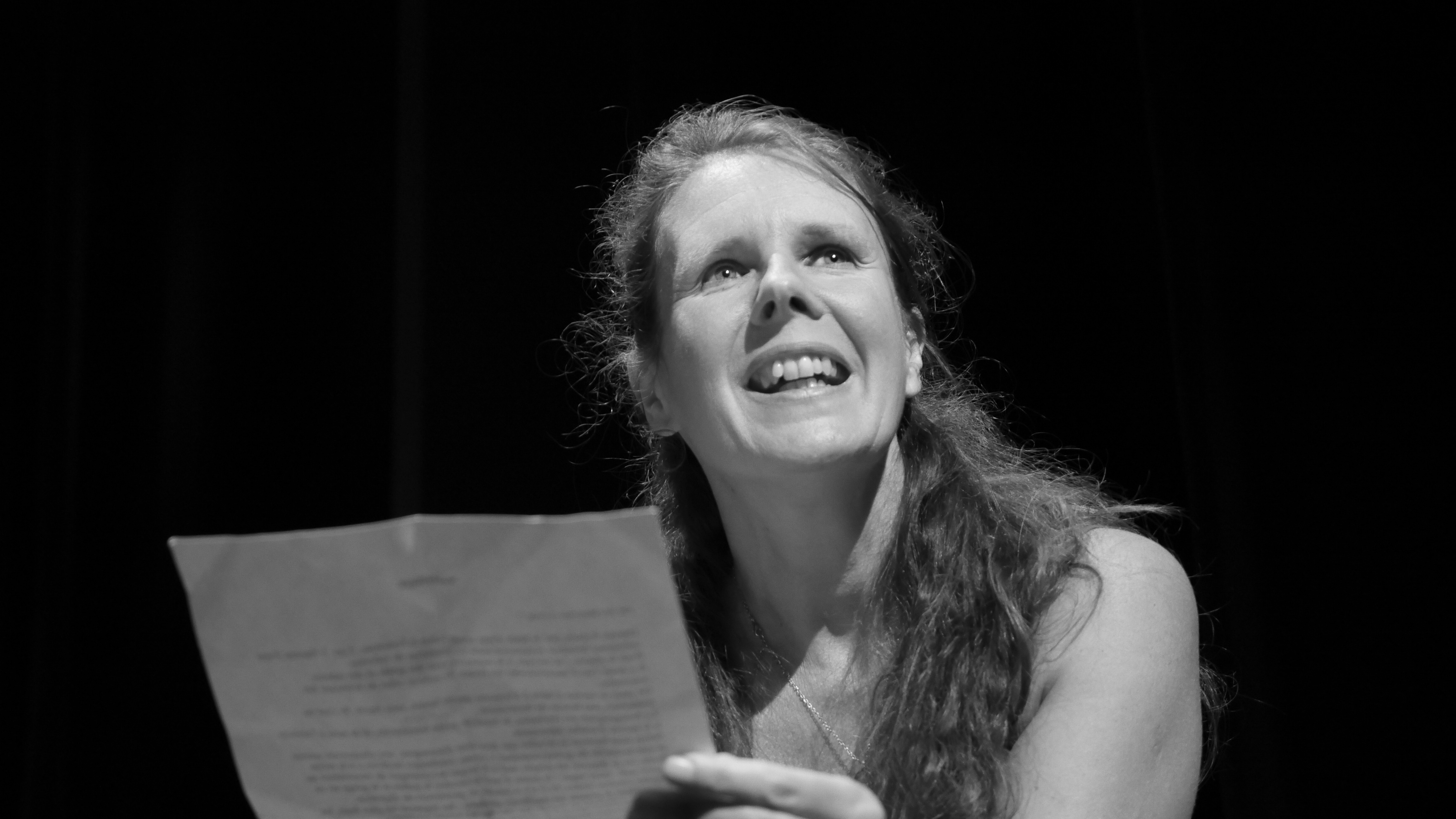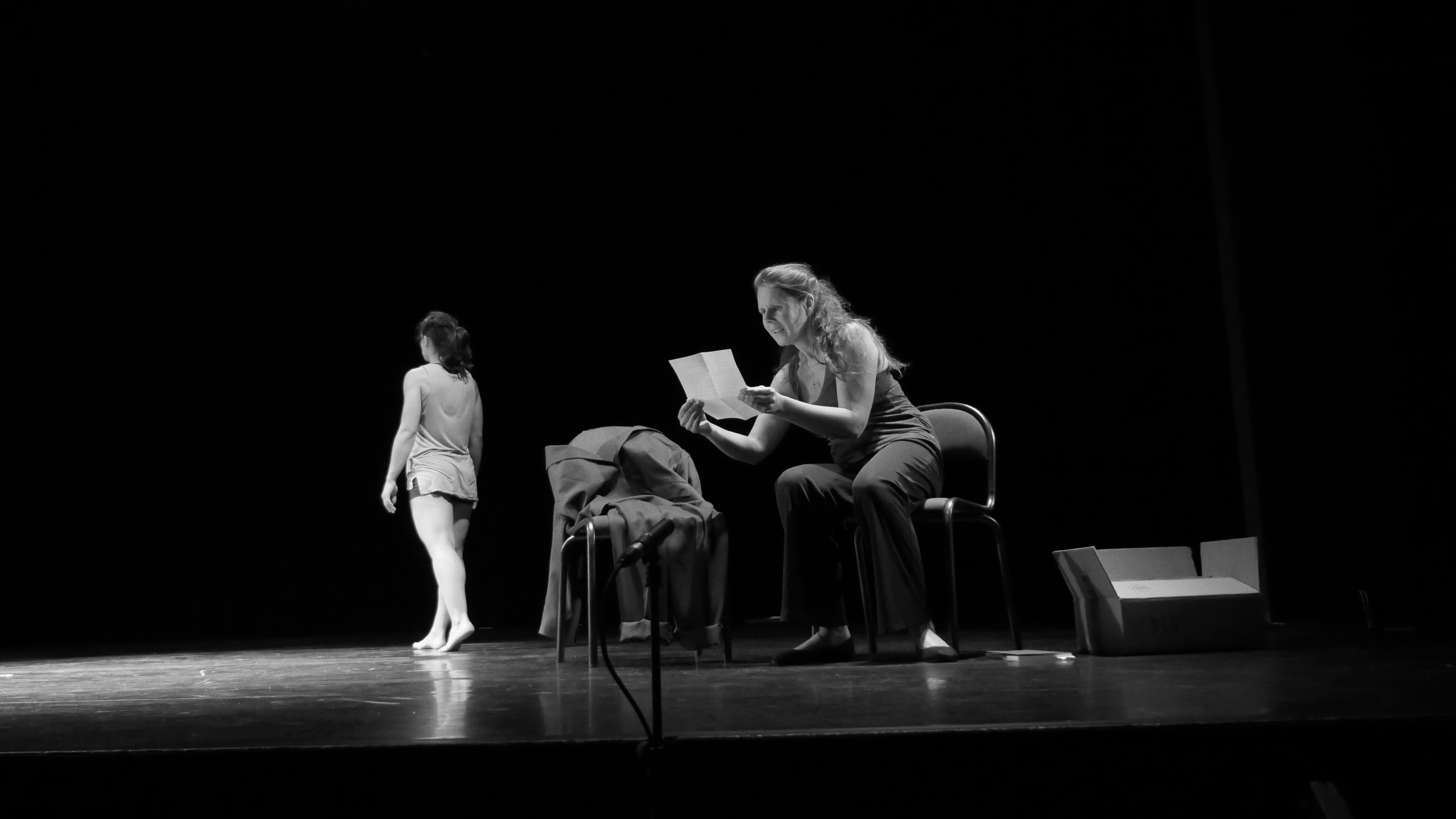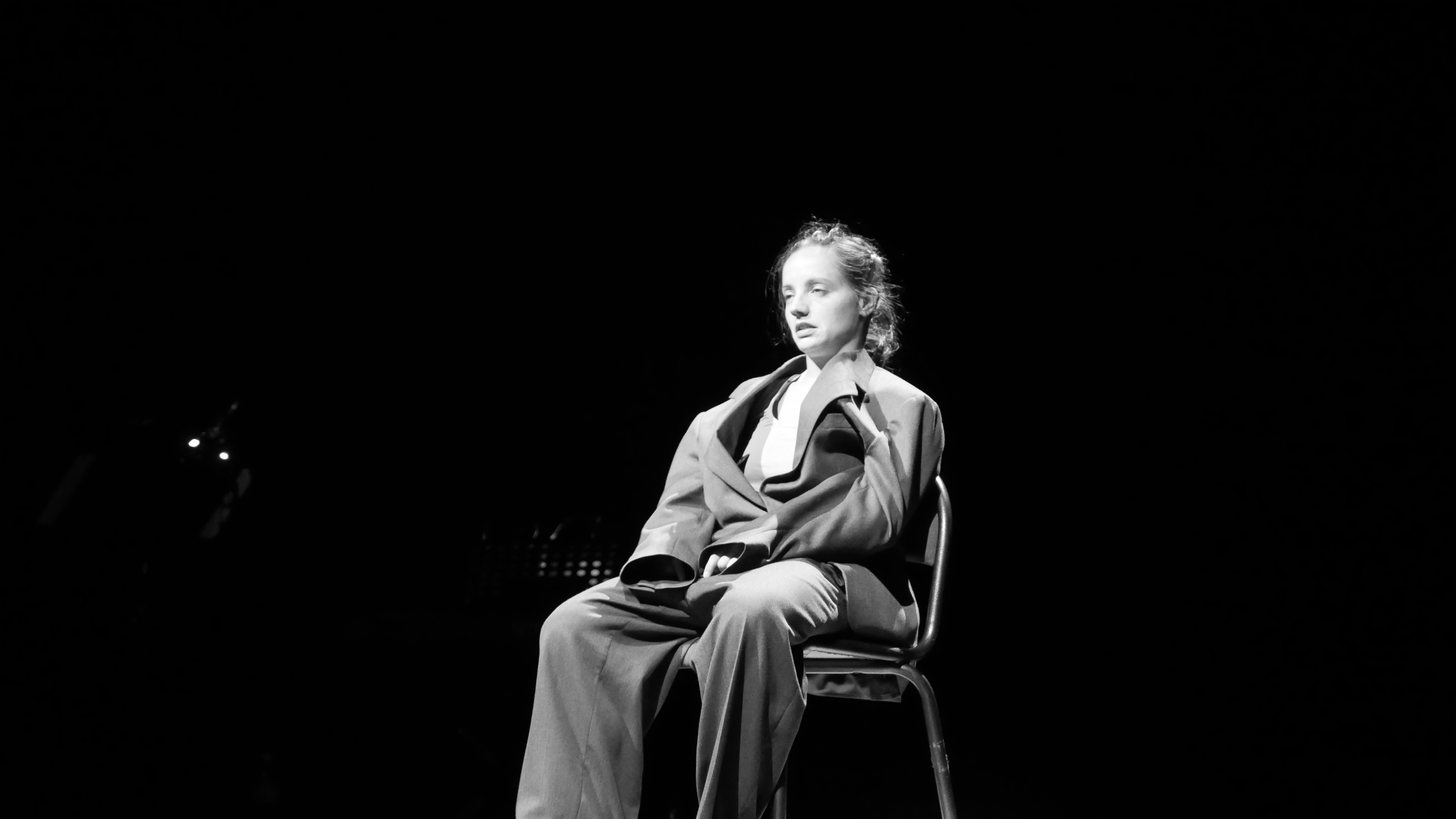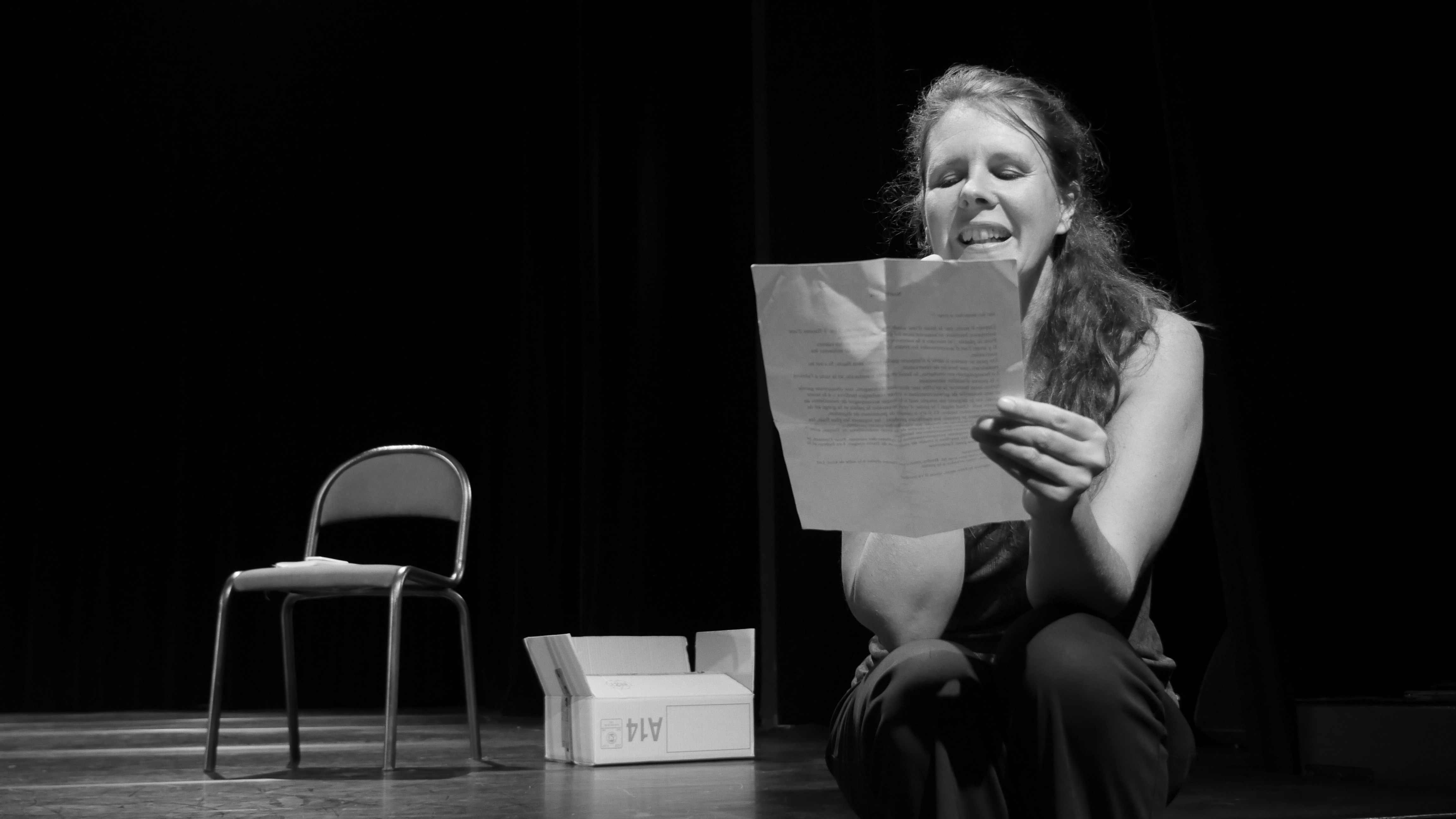 Anne comme une conteuse se déplace d’un espace à l’autre de la scène ; le déplacement introduit le changement de personnage ; elle déclame à voix haute des extraits de chacun de ces récits. Elle est le porte-voix de ceux-là qui n’en ont plus ; par-là elle maintient vivantes ces histoires qui restent des histoires d’espoir.