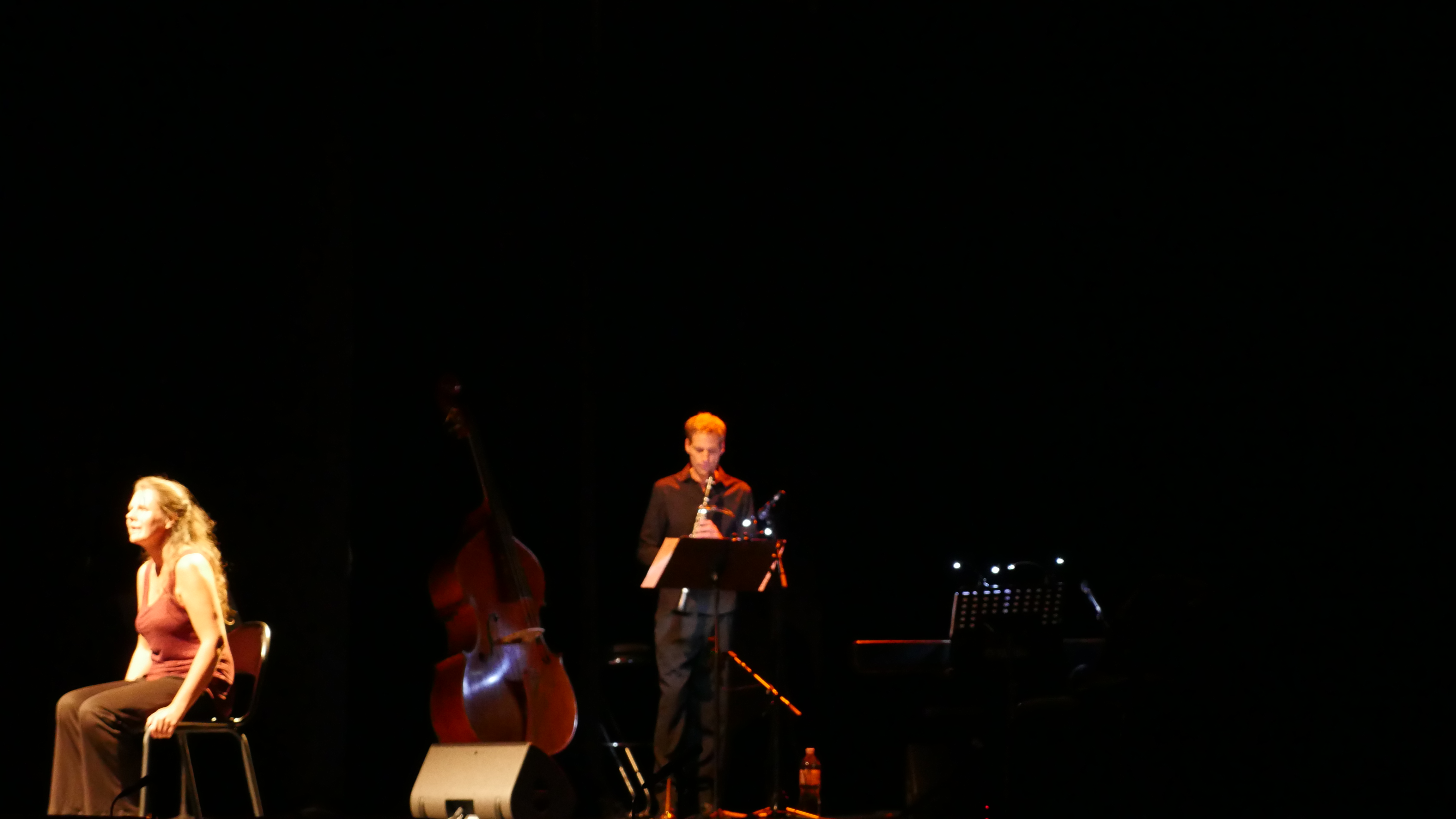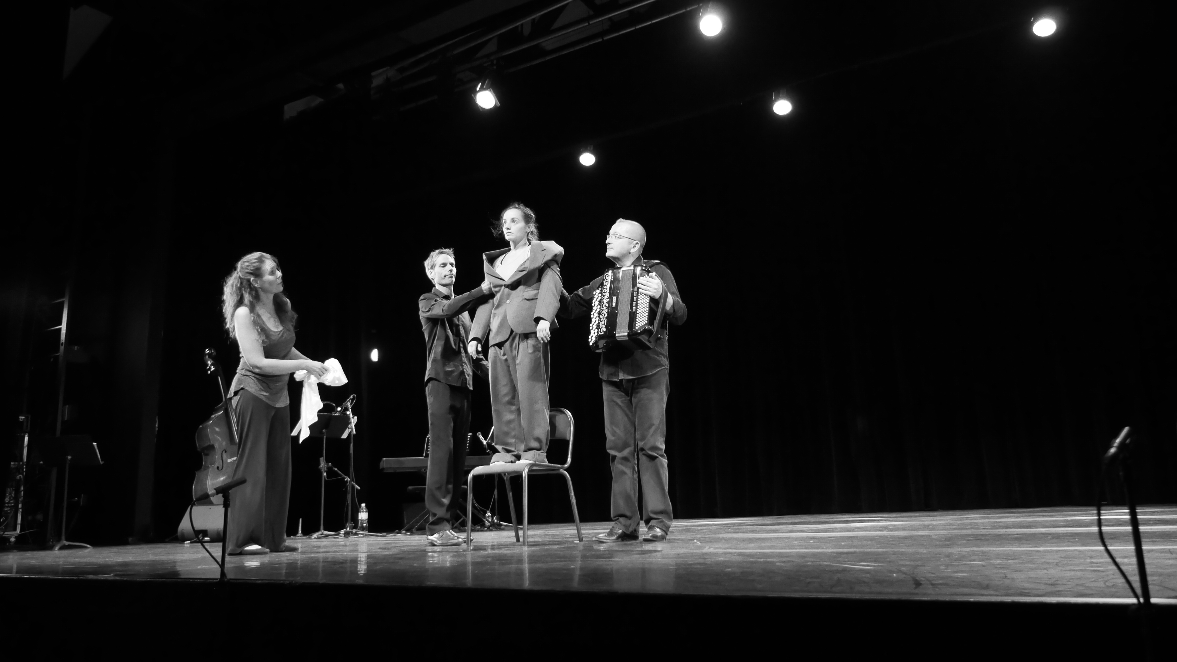 Deux musiciens (piano, clarinette, Contrebasse), une danseuse et une chanteuse - raconteuse de textes tressent un canevas délicat où la réalité abrupte et implacable côtoie la poésie, l'humour et parfois le grotesque.