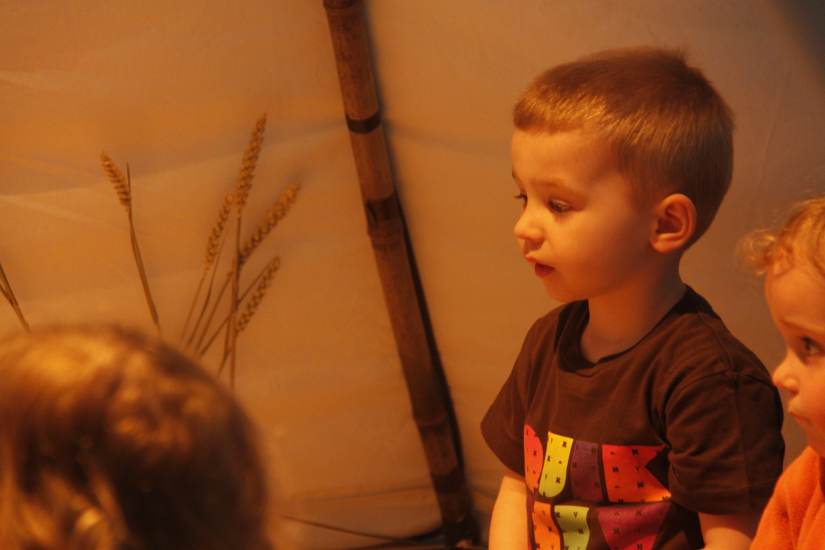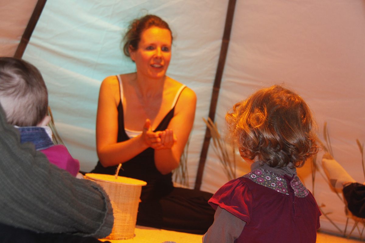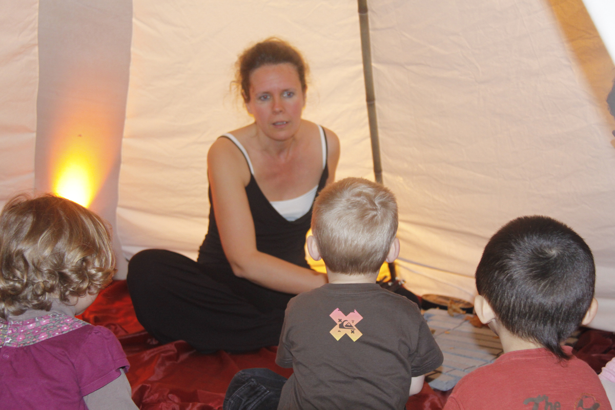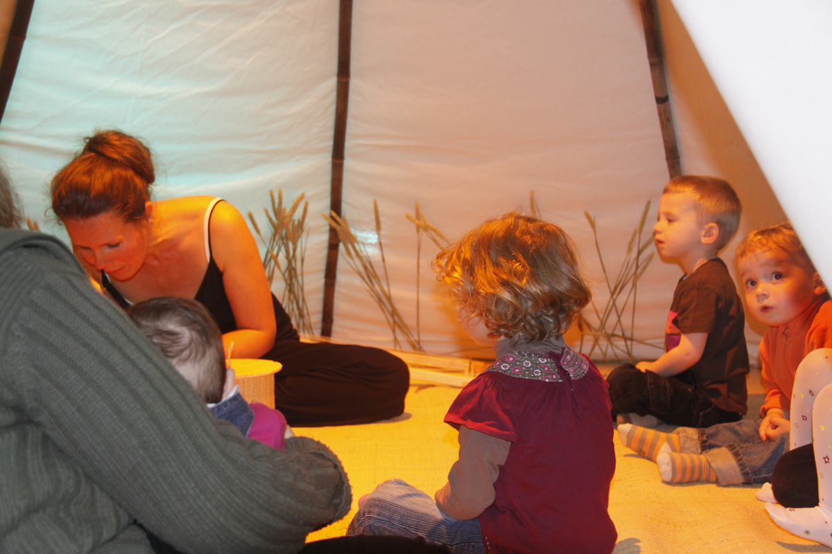 Puis les enfants suivent la conteuse de tipi en tipi où, à l'intérieur de chacun d'eux, les attendent des univers de sons, de couleurs, d'odeurs et de matières.