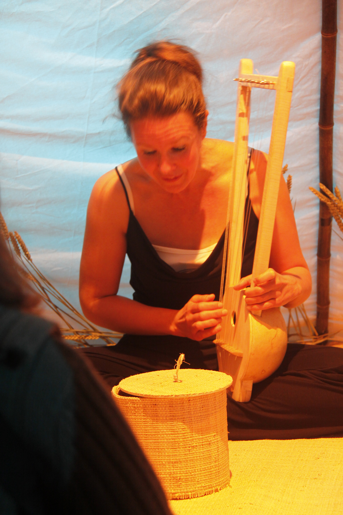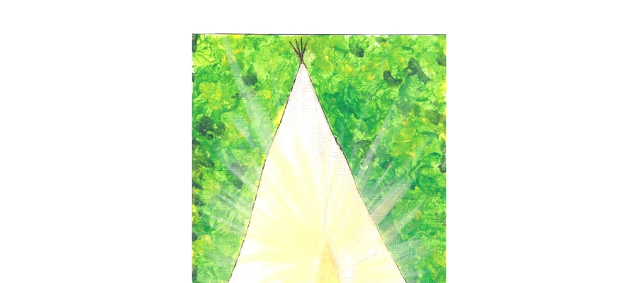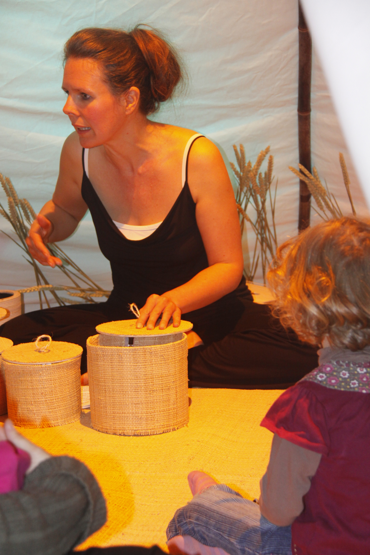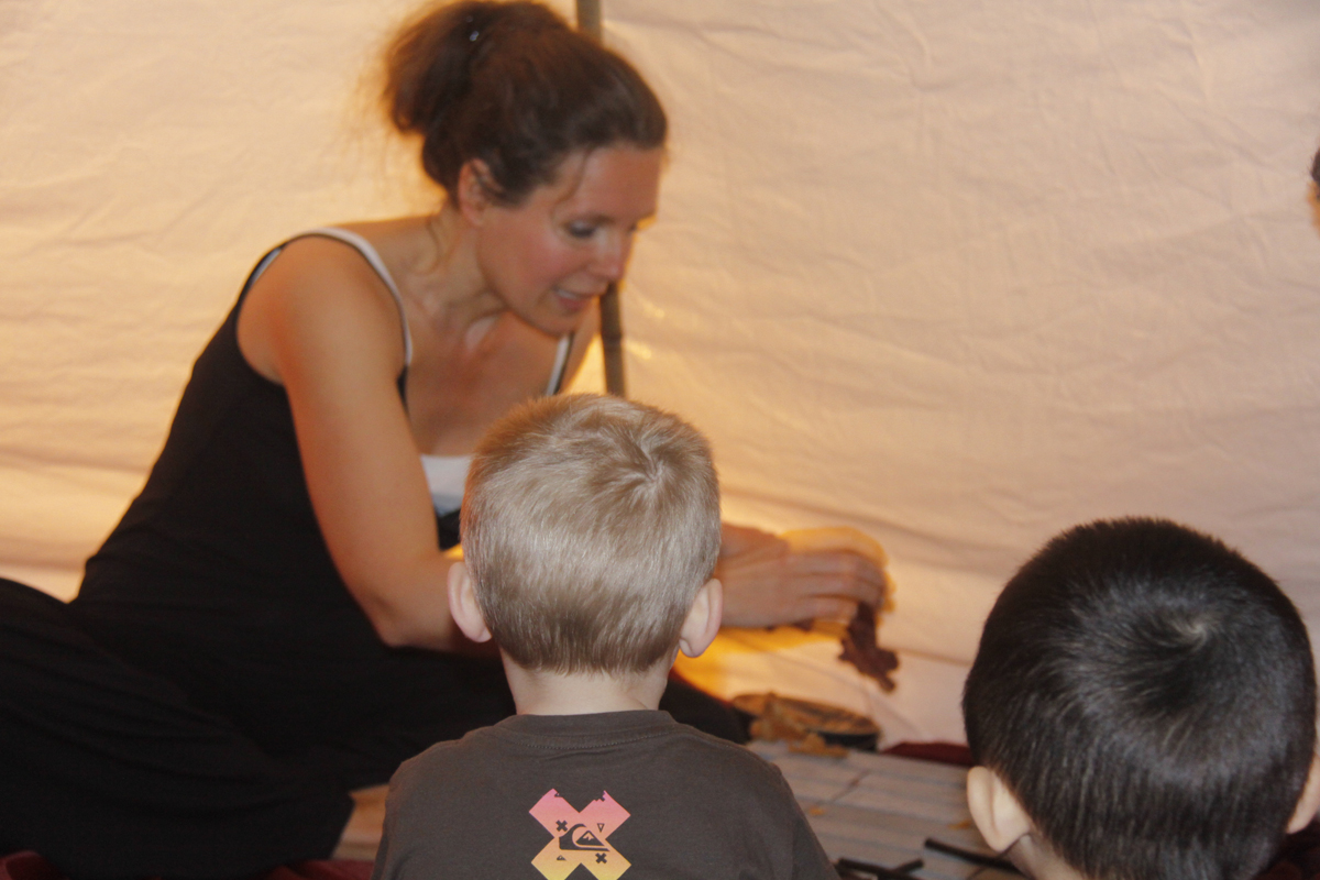 Puis les enfants suivent la conteuse de tipi en tipi où, à l'intérieur de chacun d'eux, les attendent des univers de sons, de couleurs, d'odeurs et de matières.