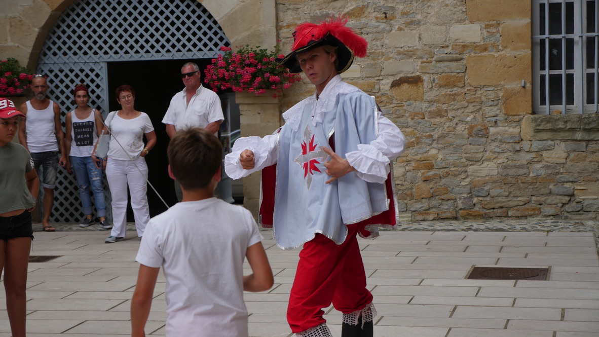 Mise en scène, lors d'un spectacle déambulatoire, d'une histoire faisant découvrir l'histoire d'un mousquetaire et de la ville fortifiée de Navarrenx.